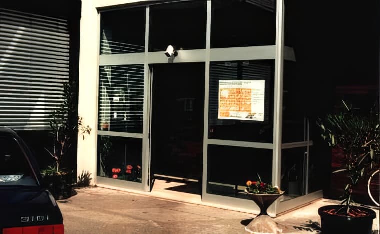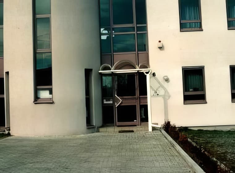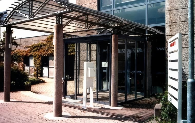 Objekt Bürogebäude - Eingangsvorbau mit Steinsäulen, Rundstahlprofilen und Acrylglaseindeckung. Eingang mit automatischer Schiebetür.