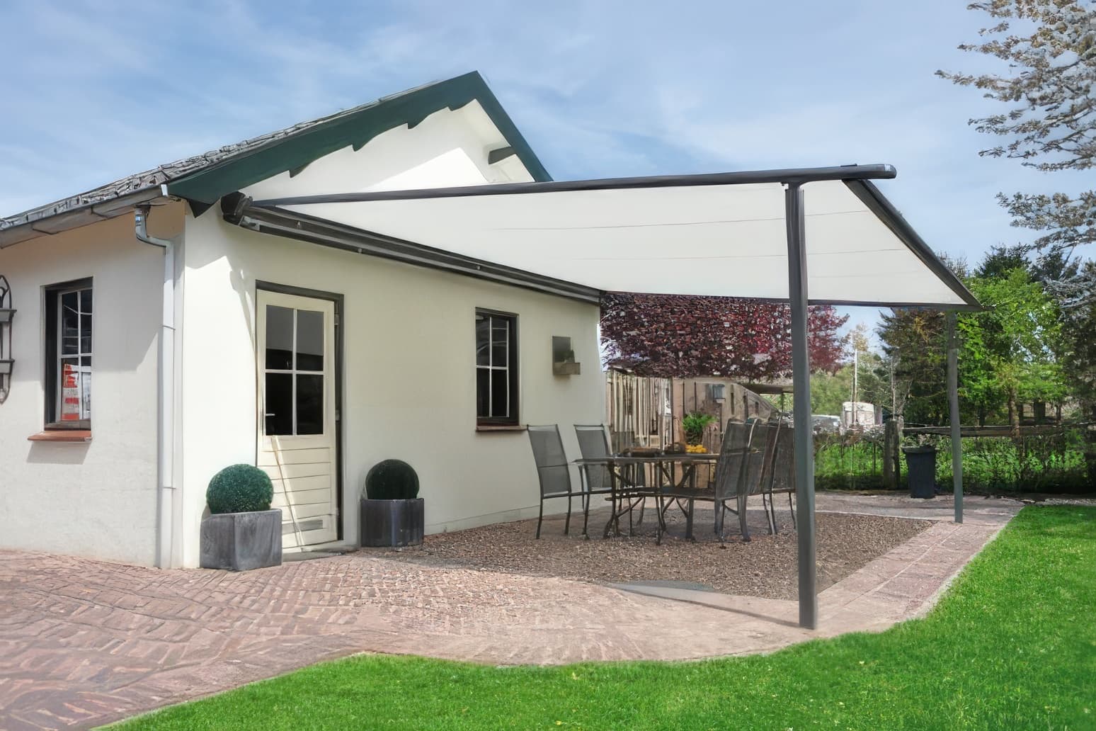 Pergola Markise, vorne mit Stützen - auch als leichter Regenschutz nutzbar
