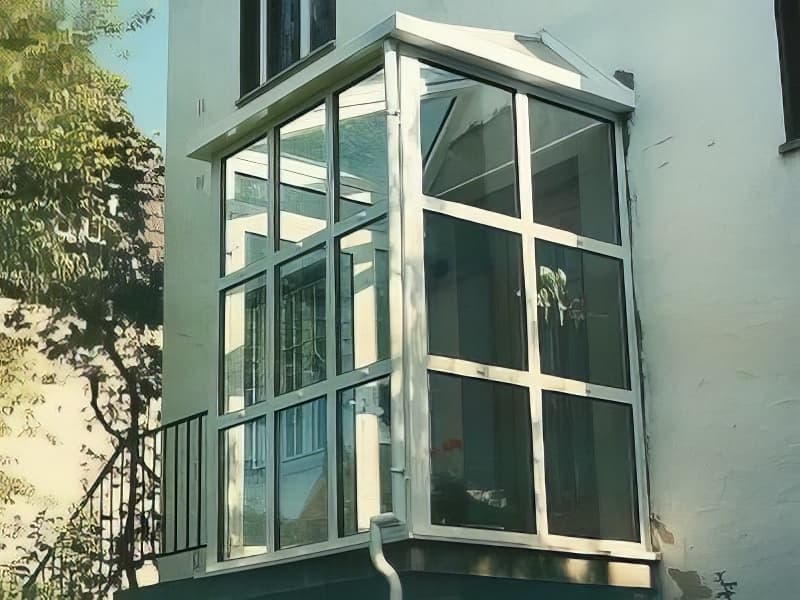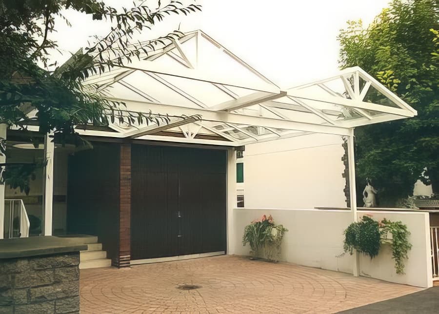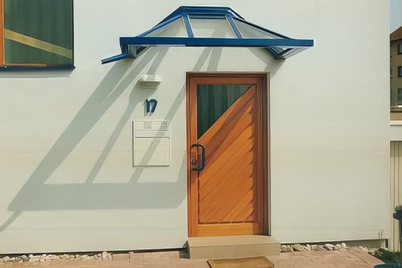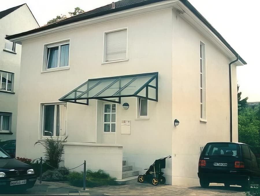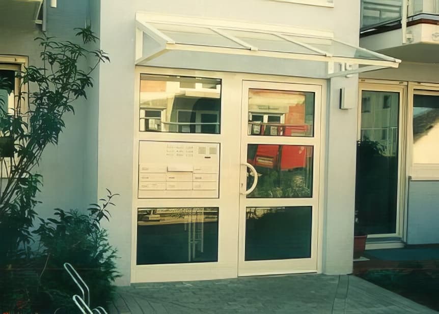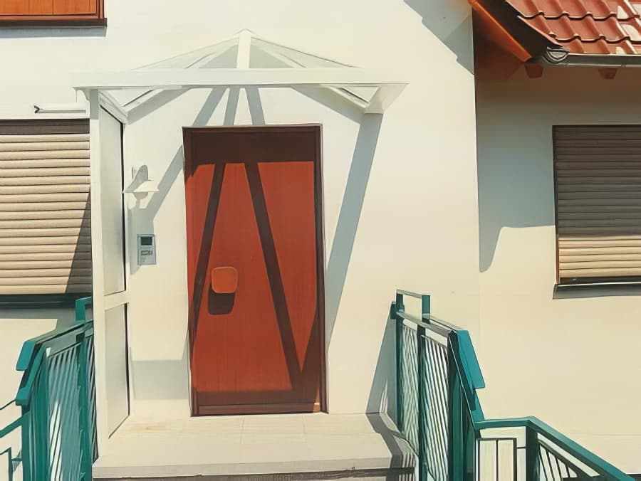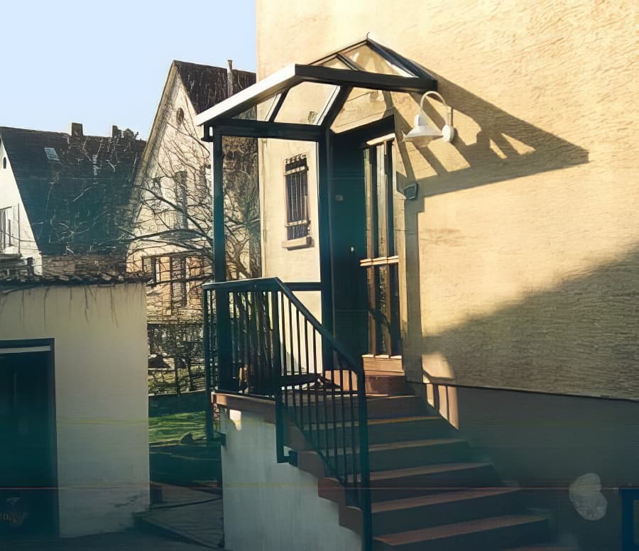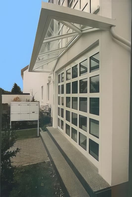 Moderne Vordach aus Aluminium und Glas bietet optimalen Schutz vor Regen und schafft gleichzeitig einen einladenden Eingangsbereich.