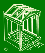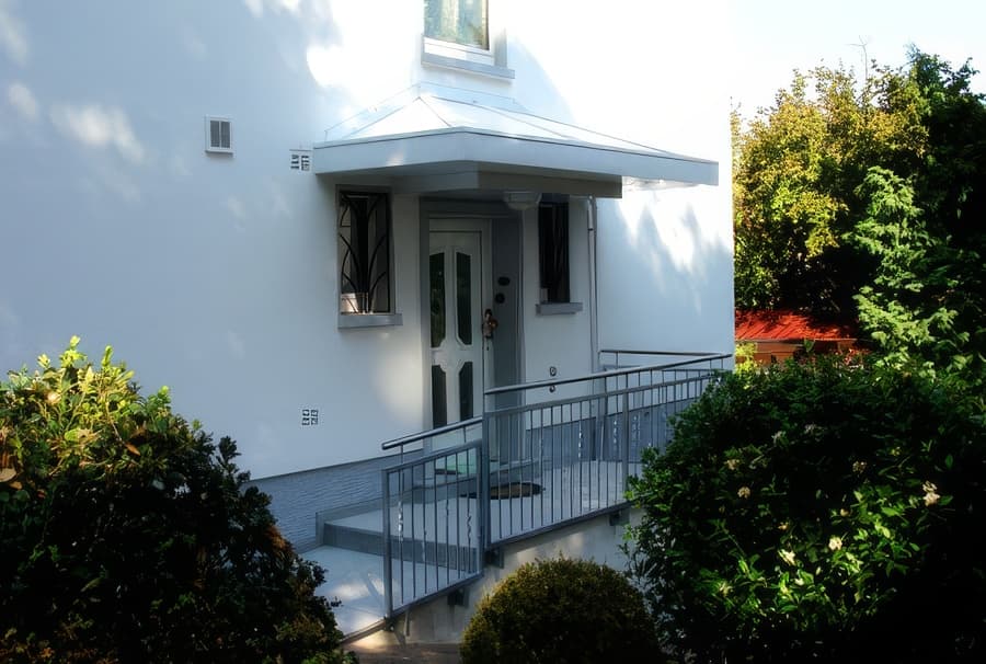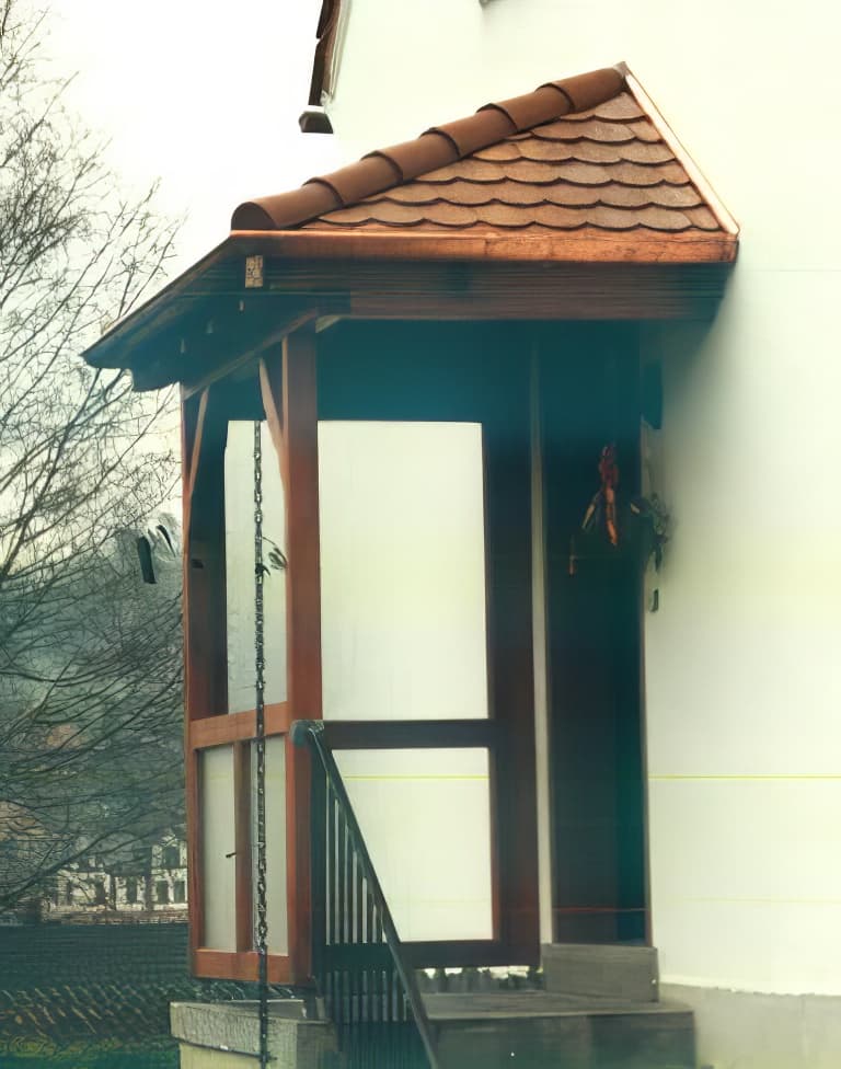 Satteldachförmiges Vordach mit Stahl-Anker als Aussteifung